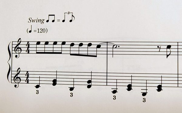 出だしの右手の八分音符は、上にSwingの指示があるように、実際に弾く時は3連で「跳ねた」感じで弾きます。